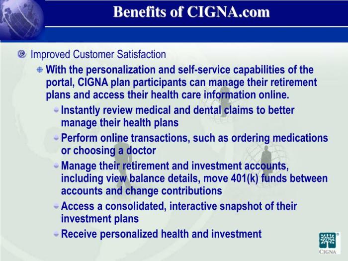 The benefits are visually depicted through engaging visuals of happy and healthy individuals, accompanied by narratives of how Cigna's services have positively impacted their lives.